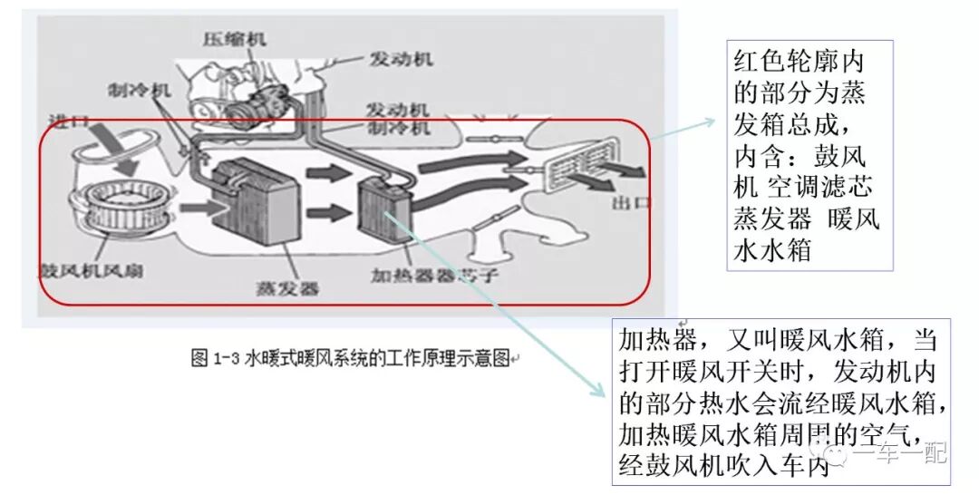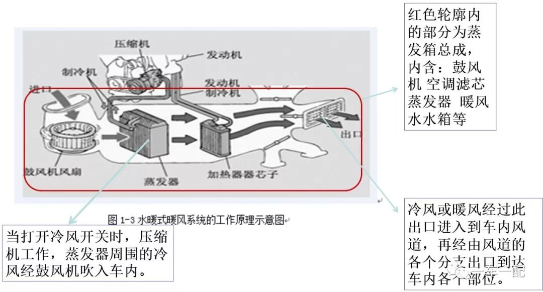 2.暖风系统:主要用于取暖,对车室内空气或由外部进入车室内的新鲜空气进行加热,达到取暖、除湿的目的。