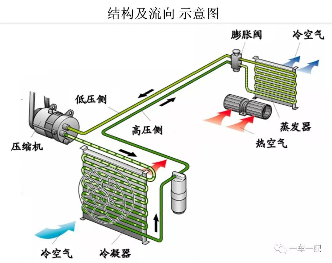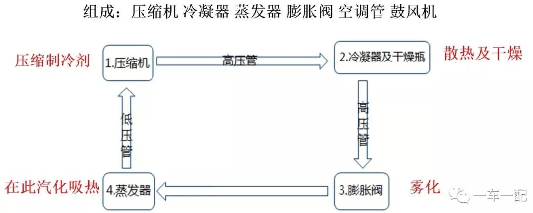 1.制冷系统:对车室内空气或由外部进入车室内的新鲜空气进行冷却或除湿,使车室内空气变得凉爽舒适。