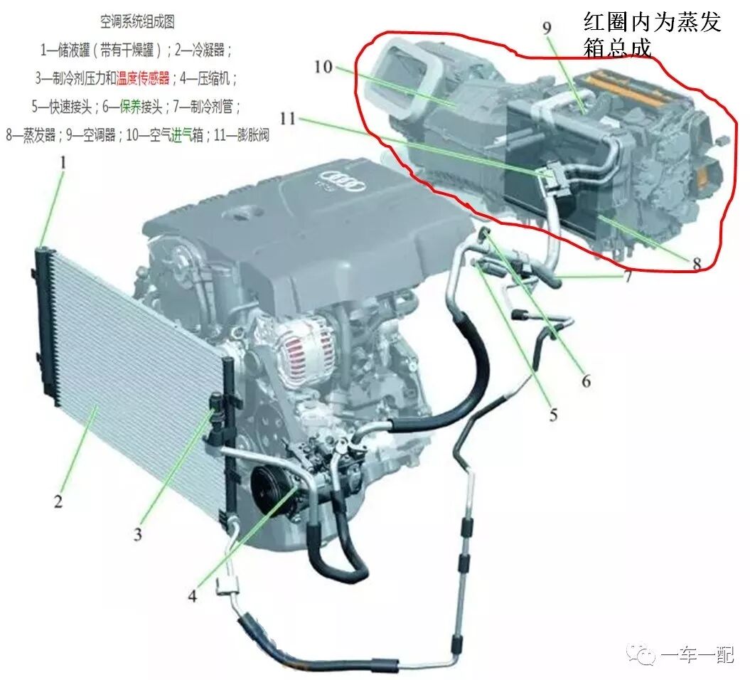 1.压缩机:经空调皮带由发动机曲轴皮带轮带动,压缩制冷剂,将常温常压制冷器压缩成高温高压汽态制冷剂。
